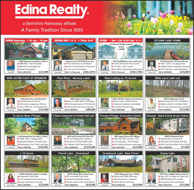 Edina Realty a Berkshire Hathaway affiliate A Family Tradition Since 1955 OPEN Saturday 10 am 12 pm | OPEN SAT 11-1 Thur 4-6 OPEN Sat 1:30-3:30 Sun 11-1 SYLVAN LAKE HOME Our Newest Design Concept Starting 1923 Red Oak Drive SW East Gul Lake 14468 Memorywood Drive, Baxter 4BR/3BA-Open Floorplan Stop in 1st 15139 Warrior Ave. Thomas Allen HomesThe Meadows THE HARBOR at East Gull Lake Lecated 2 Blocks before Ersie's on Gull 2 Vicwable, 3 sold 3 reserved 4 bed/2 bath/2 car garage home ·Beautiful Landscaped Lot Updatod: kitchon, flooring&fresh paint 62' of shoreline-hard sand bottom" Homes4 Growing Families or "Downsiners Great Curb Appeal! level, 2 level,3 level Homes Pol. Meita,Storage Garage, Puting Green $235,000David Merin1 levet, 2 D a MLS W Several S450k-$700 TMIS#11 Plan·AvaiL $164k-$295k 1 MLS #4958038 5330,000 IMSAM, RIE, ARIJas NEW LISTING EAST OF BRAINERD Pine River Norway Lake! New Listing on 10 Acres! Mille Lacs Lake Lot 11283 Gull River Road, East Gull Lake 60XX Edgewater Cirele 13696 State Hwy. 210 Brainerd 4 6809 Indian Trail Lane bod Zbath home os 4.89 Acre Walk-out style, wrapped deck, 28148 Adj to 1000's ofAc Co& Municipal land Nestled anong he pies 20ef lakefroet Lake side deck wraps around to fall porch. Close to toun, escellent location 3 bedroom 2 bath home with updates Just north of the golf course East facing lot w'157' of lakeshorc Ideally suited for a walkout ievel City sewer and natural gas available A3-5MLS W4960075 -2 MIS 4959251 TMLS 49592846 $$229,000 IMLS #4816071 $159,000 12 Acres Near Pillager 3 Home Compound on Premier Gull Lake Private Pillager Executive Estate Seasonal Beach & Dock Access Pelican 6219 Roundview Dr. Drive, Motley 4BR, 3 BA, 5 Garage Stalls Beautiful Kichen w/Granidc T Maintenance Free Vinyl Log Siding 91 Gall View Road SW, Nissa M 3550 Alpine Drive SW, Pillager 30059 Whitebirch Way 103 Level Shorcline New Coestruction Whisebioch Resort-Broeay Pot 4BR,4BA,4900 ft bome, 3.45 ae 3 car beated garage 38x12 workshop Main Hous 1526q F4 Bods3 Baths 2 Additioeal1 Bed1 Bath Geest Cabis 2008 Krof Loft Park Model, Shodl Dock Bich Floork Privacy Blisds, Loft wFull Bed |#xofre ad $344.900.35-0 $1,029,000 | | Ema s $445,000 MLS#4915649 1.75 Acres Placid Lake Deerwood Crookneck Lake New Price Camp Lake 24518 Placid Drive, Deerwood 203, on bautiful Lake Placid. Attached and Detached Garages Granite counters in the custom kitchen 33301 Dogwood Lane Motley Quality buik 3BR 3BA home 13590 Kimmberly Road, Crosslake 4 bedroom 3 bath home 3 car insulated and heated garage Large maintenance froe deck 5250 Forest Ridge Road, Garrison Enjoy 245'of frontage on Camp Lake! 4BR/2B/Main Floor Laundry Living room with wood fircplace. I MI.S #491 1 1 69 $630,000 Judly Nitric mer Perfoct pla S630,000 area.4M7 1 MLS #4942478 $238,000Jerey Mtilie SILS 4911169$315.000 8 849 7633 MLS #4954952 18-81-89 MLS 148454SS NMI/.IM